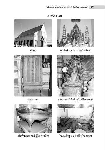 วัดในเขตอ�ำเภอเมืองอุบลรำชธำนี จังหวัดอุบลรำชธำนี 277 ภาพประกอบ อุโบสถ พระมิ่งเมืองพระประธานในอุโบสถ ตู้พระธรรม พระปางมารวิชัยประทับเหนือขนดนาค เม็งหรือธรรมาสน์ปาฏิโมกข์ขาสิงห์ โบราณวัตถุ และศิลปวัตถุในหอสมุด